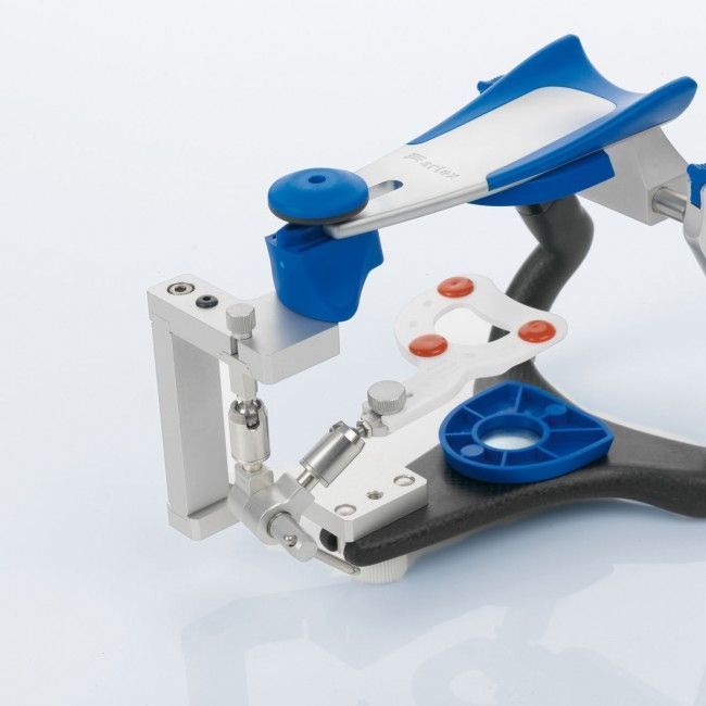 Альтернатива артикуляционному столику или лицевой дуге. К каретке фиксируются суставной механизм и прикусная вилка, зафиксированный регистрат в соотношении к шаровой оси закрепляется на «Artex®» основе.