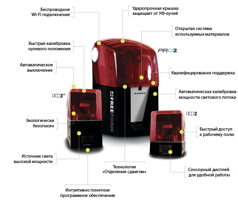 Компактный, профессиональный, стереолитографический, трехмерный принтер серии Freeform PICO 2 HD, предназначенный для использования в ювелирном деле, стоматологии и ортодонтии, а также для создания высокоточных дизайнерских прототипов из фотополимерных смол. Минимальная толщина наносимого слоя составляет всего 1 µм. Передача данных для печати осуществляется с помощью Ethernet и WiFi соединения.