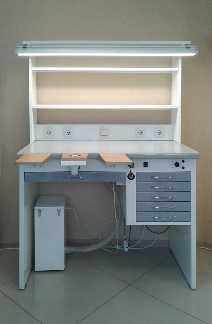 Стол для оборудования рабочего места зубного техника. Оснащается обдувочным соплом, светильником, регулятором мощности вытяжного устройства, подлокотниками.