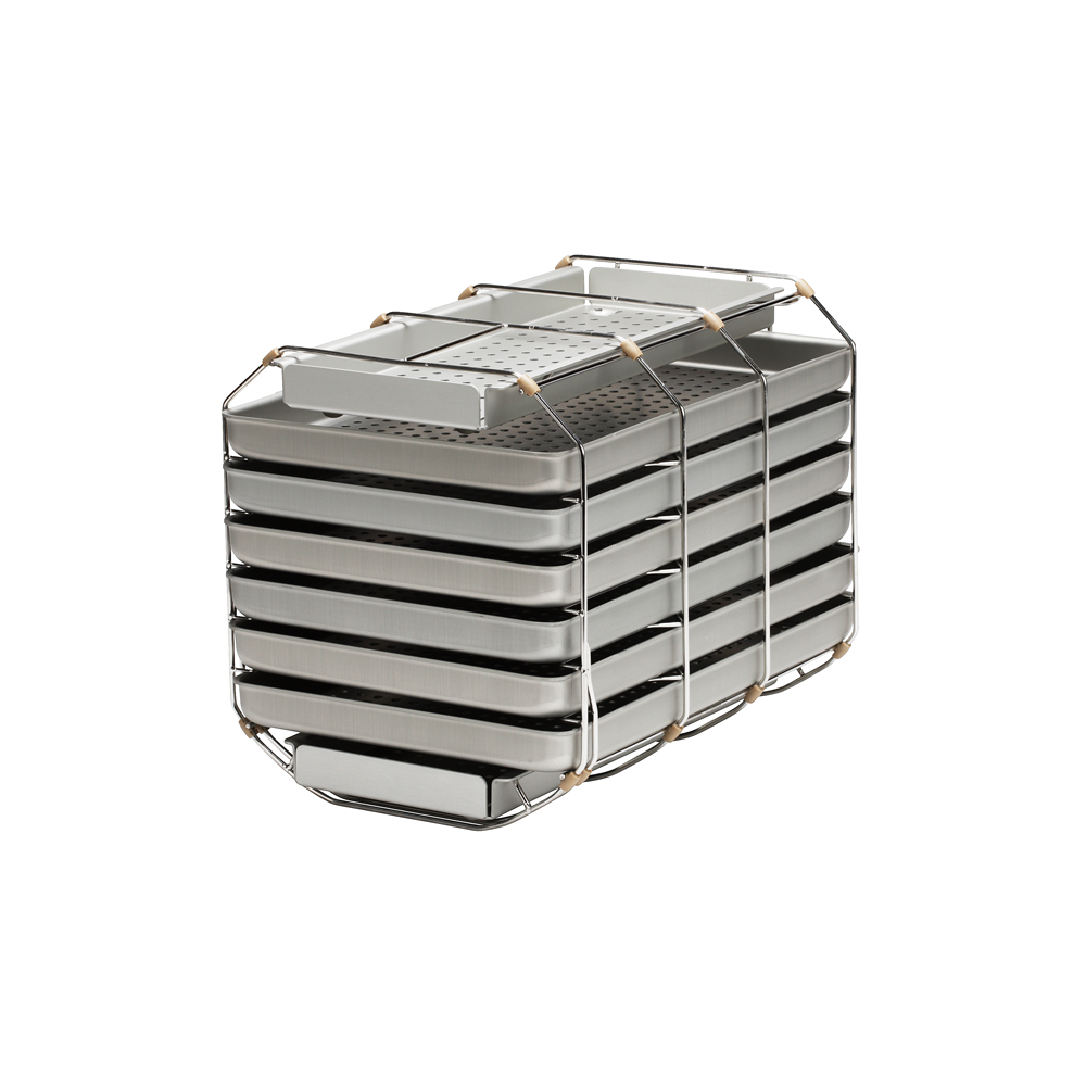 Камера оснащена каркасом с 6 лотками, подходящим также для установки 3 стандартных кассет. Наконечники без упаковки стерилизуются 10 минут (включая время сушки), упакованные — 17 минут.