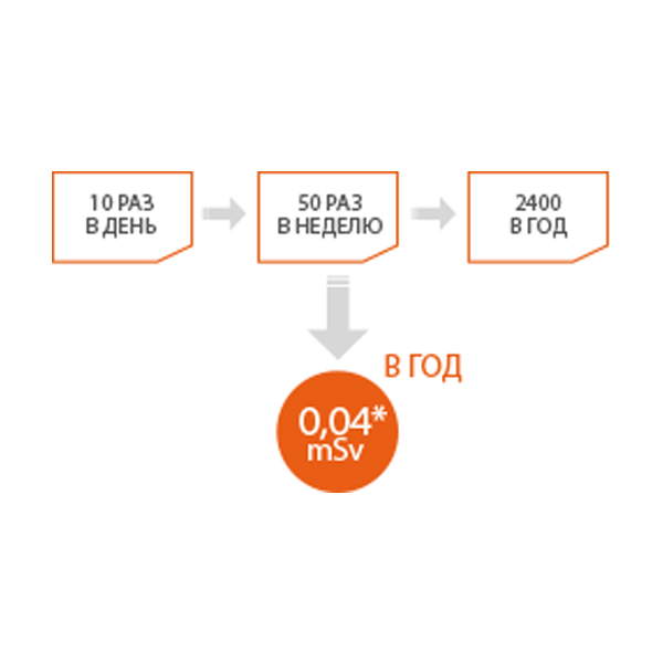 Параметры безопасностиГодовая доза облучения оператора от аппарата REXTAR при экспозиции 0,2 сек.Количество снимков * При допустимой норме в год для оператора 5 mSv |