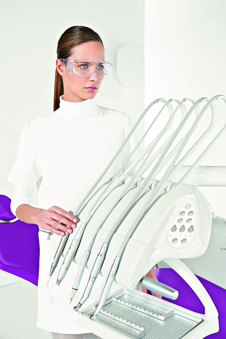 - Съёмная автоклавируемая керамическая плевательница, поворачивающаяся на 180°.