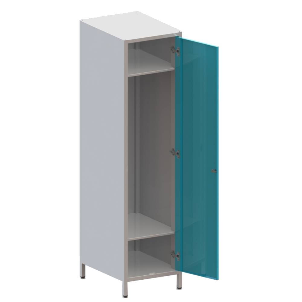Шкаф одностворчатый, цельносварной конструкции с замком на дверке. Внутри шкафа расположена полка для головных уборов, полка для сменной обуви, штанга под плечики. Дверь с замком.