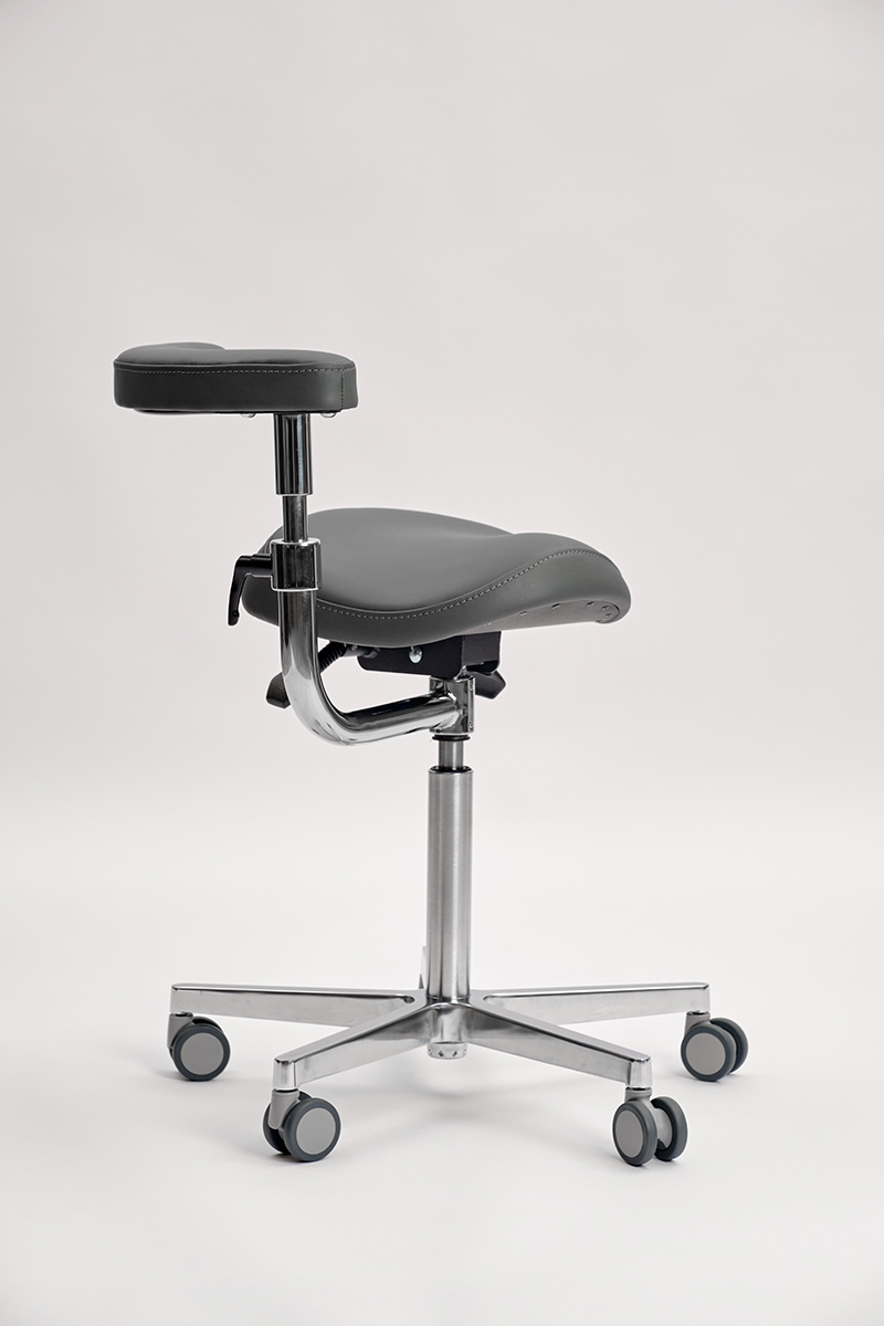 Стул оснащён абдоминальным упором, который позволяет поддерживать поясничную область врача и обеспечивает комфорт во время работы. Благодаря возможности настройки на 3600, абдоминальный упор также служит для поддержки локтей.